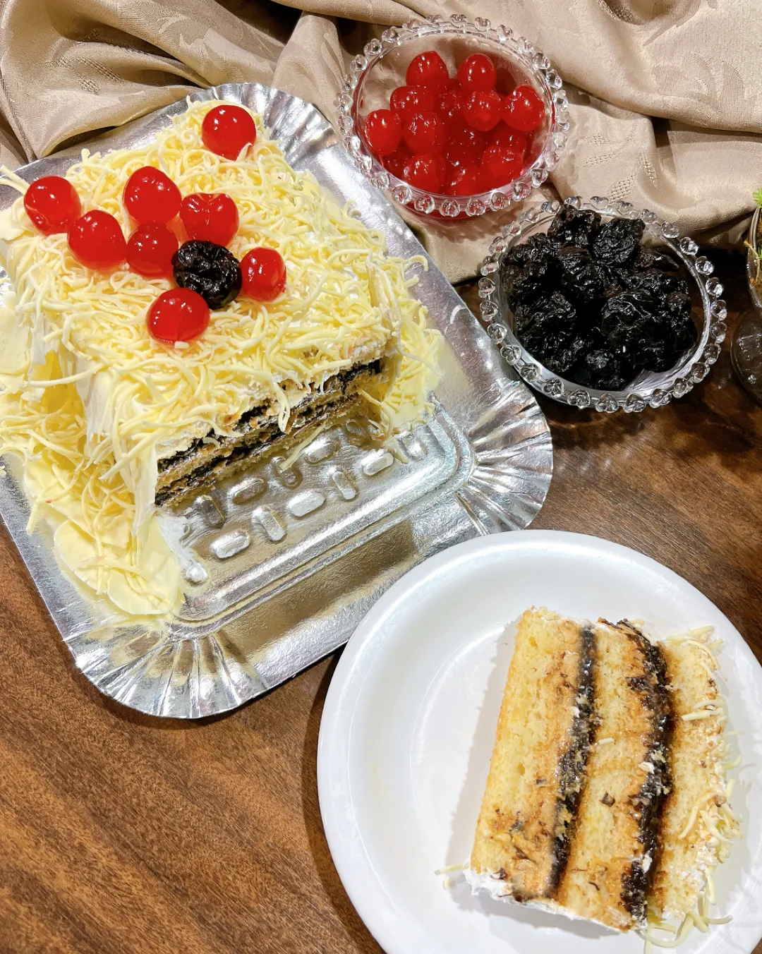 Combinação perfeita! Doce de leite com ameixa Pão de Ló natural, recheio duplo de doce de leite com ameixa. Cobertura de chantilly mesclado com doce de leite.